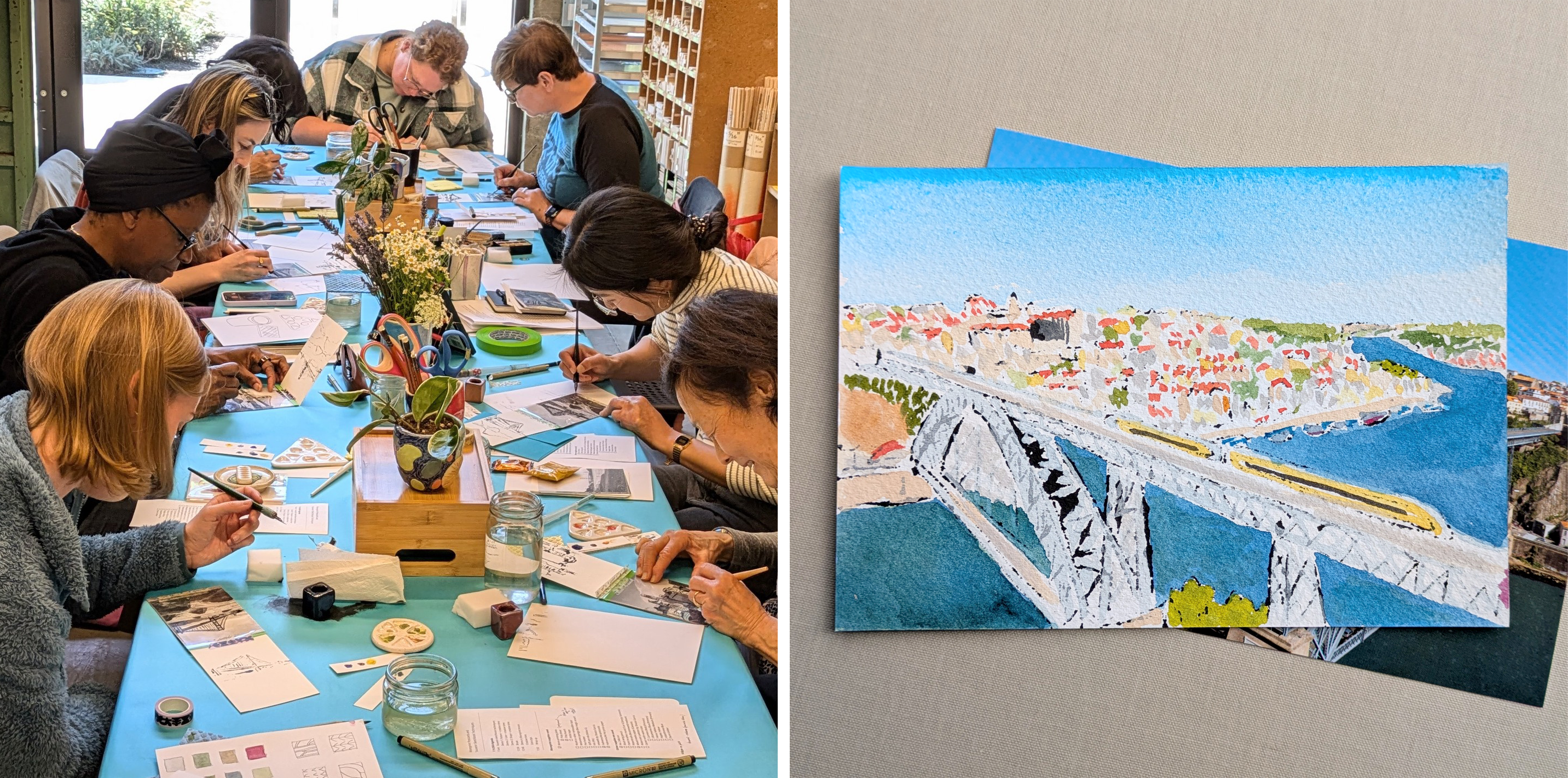 This is a sampler class of drawing, watercolor, pointed pen, and printing concepts. Perfect for creating sketchbook memories and postcard souvenirs. Read what I wrote last year about the workshop.