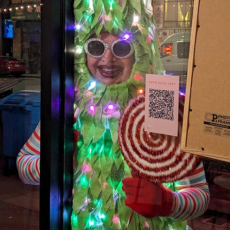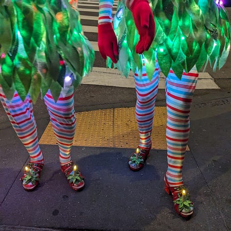 I connected with them a few years ago and have been collaborating some evenings on festive silliness. I’ve put together a holiday “cheer” outfit to assist passersby in getting in on the merriment and helping them grab a snap with the Trees for their holiday memories.